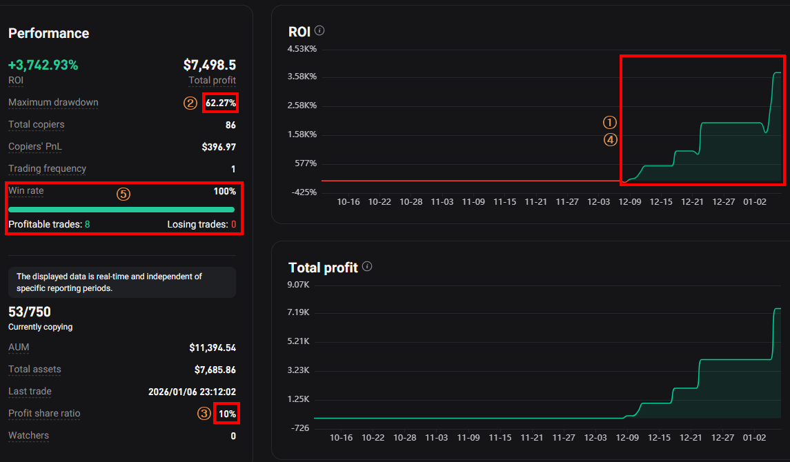 그래서 표면적인 ROI만 보고 팔로우를 결정하면, 실제로는 큰 MDD(유동 손실) 구간에 무너지거나 손실 포지션을 오래 들고 가는 방식에 휘말릴 가능성이 있습니다.