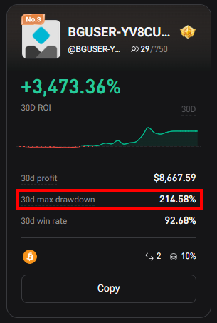 카피 트레이더의 수익률은 확정 수익이 표시되어 나타납니다. 즉, 들고 있는 포지션의 유동 손실(MDD)이 수익률에 반영되지 않습니다. 다행히 지금은 위 스샷에 MDD(max drawdown)가 표시되어 나오긴 하는데, 이건 MDD를 아는 사람에게 보이는 것일뿐, 큰 글씨로 강조된 수익률에는 이 값이 반영되어 있지 않습니다.