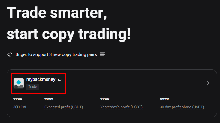 계정 정보 박스 아래 중 가장 최상단에 노출되는 위 트레이더들은 비트겟의 여러 프로그램 및 대회 등에서 좋은 성적을 기록하여 인증된 유저들이 노출되는 영역입니다.